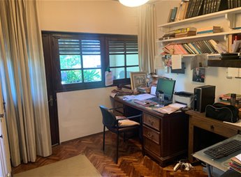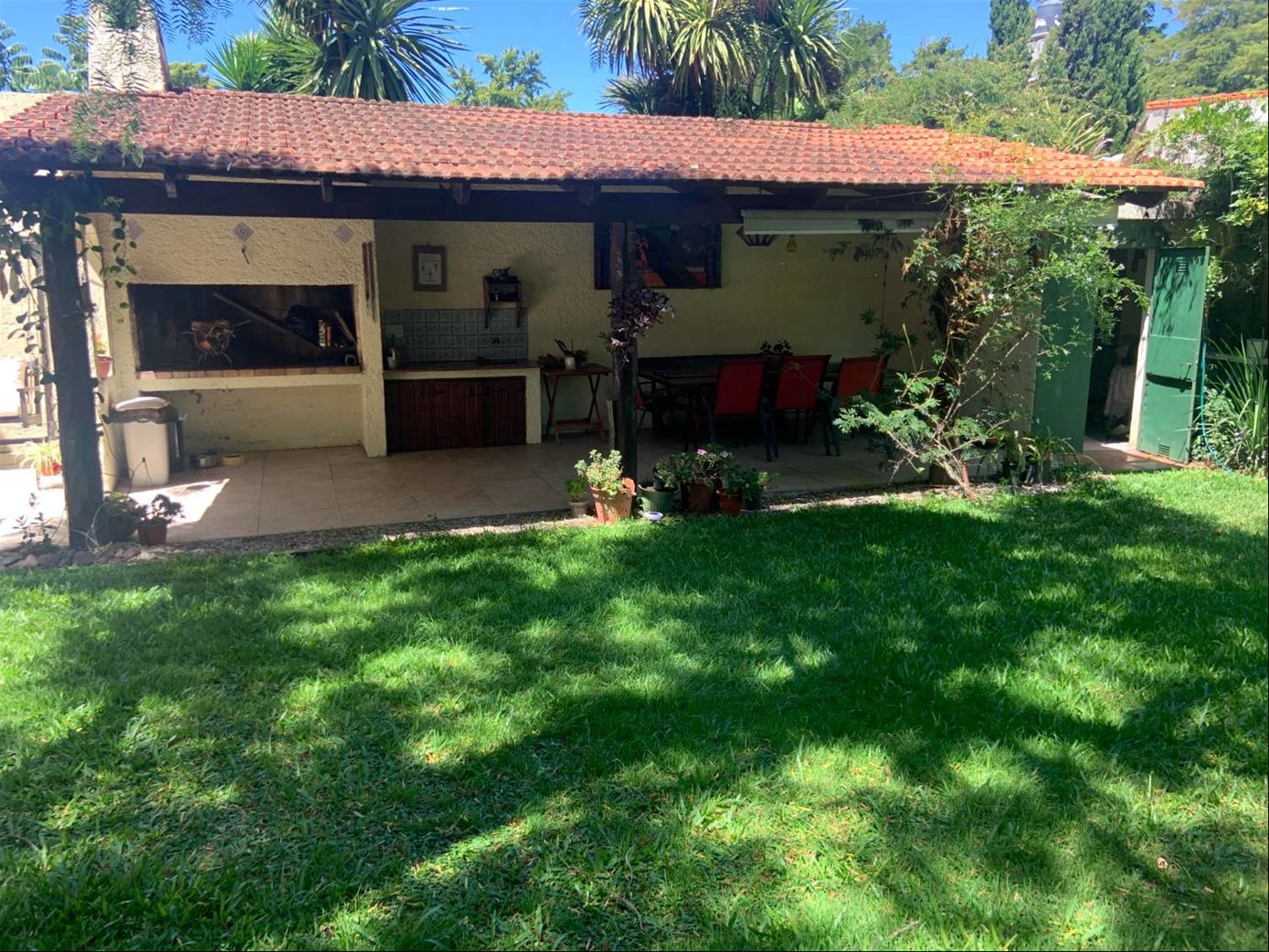 Planta baja: hall de recibo, escritorio con 1 baño, living comedor con salida al fondo, baño social, sala de estar vinculado a la cocina, fondo verde con parrillero techado y deposito con baño rustico.